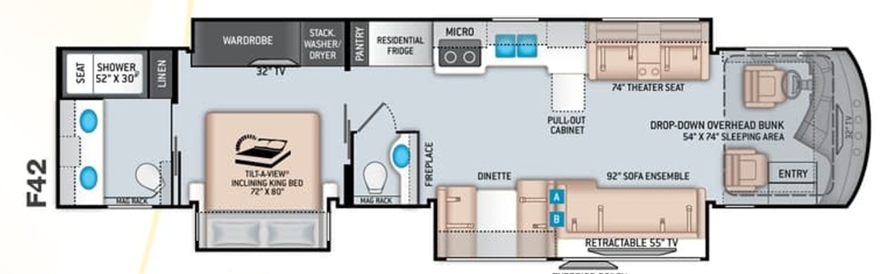 - Living Area: Features a sofa and theater seats that are placed across each other, and a booth dinette