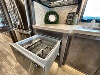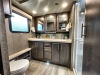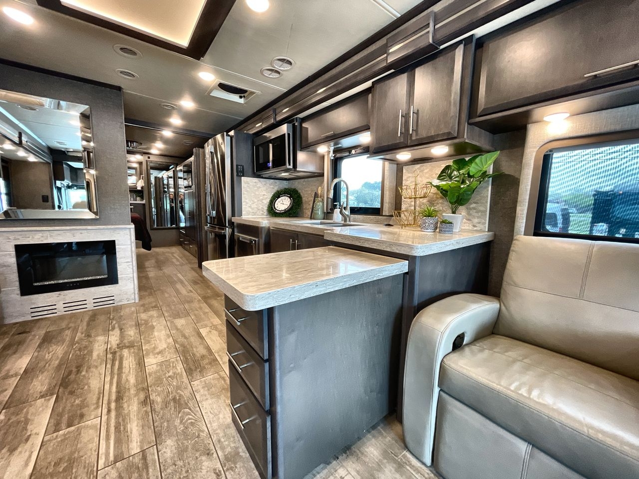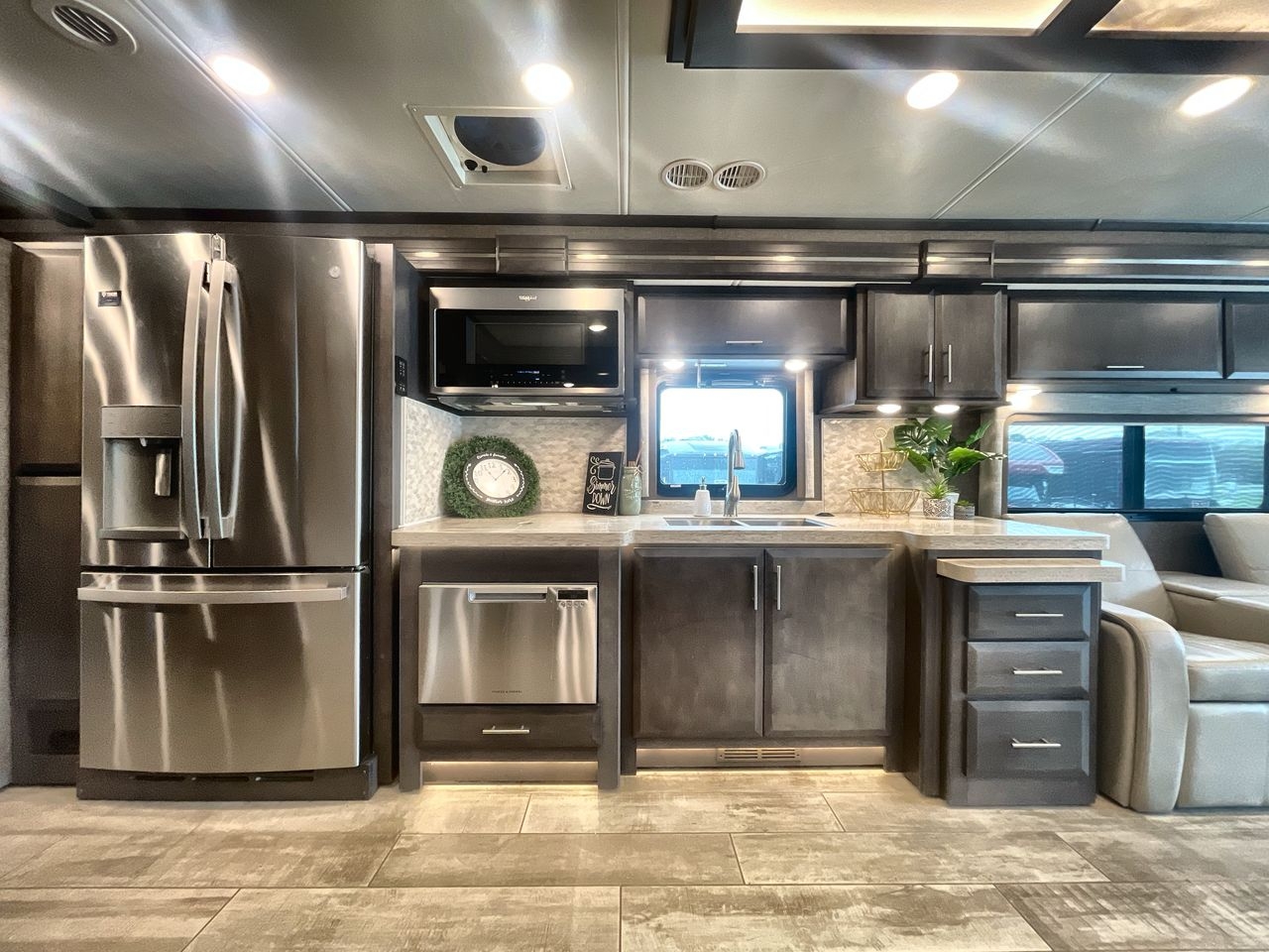 - Kitchen: Equipped with a full-size residential refrigerator, modern appliances, a diswasher, a retractable counter space, and solid countertops